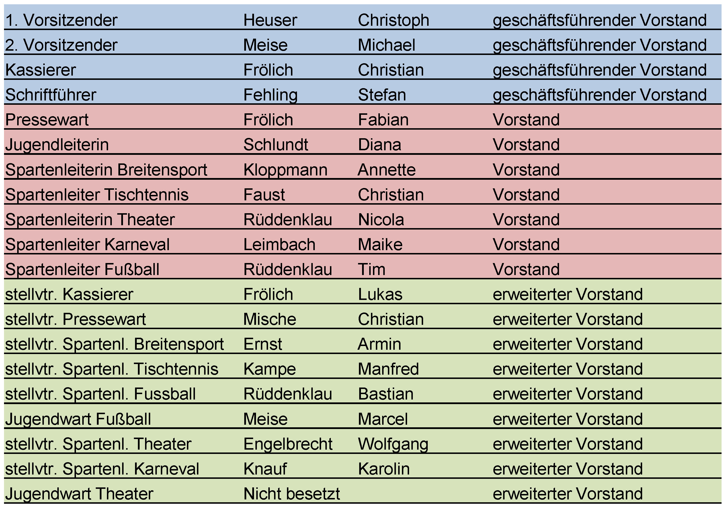 Nach den Wahlen in den Spartensitzungen und den Wahlen auf der Mitgliederversammlung setzt sich der Vorstand des TVW wie aus der nebenstehenden Übersicht ersichtlich zusammen. Wir wünschen allen Vorstandsmitgliedern bei Ihrer Tätigkeit gutes Gelingen.