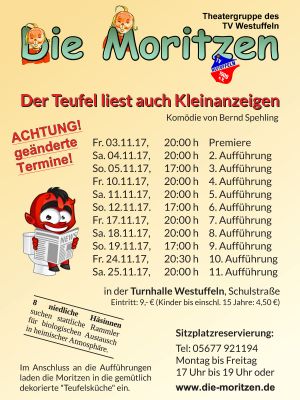 Aufgrund eines Trauerfalls finden die Aufführungen am 28.10. und am 29.10.2017 nicht statt. Die Moritzen spielen stattdessen am 19.11.17 um 17:00 Uhr, am 24.11.17 um 20:30 Uhr und am 25.11.17 um 20:00 Uhr.
