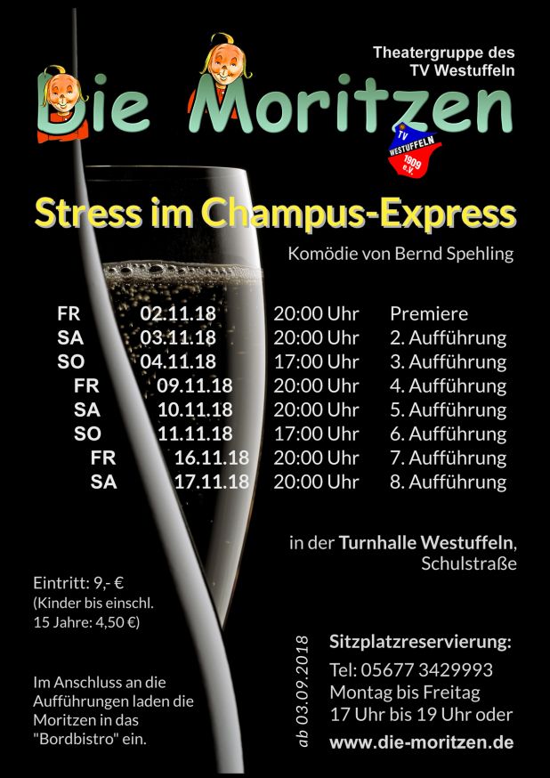 Ab dem 02.11.2018 spielen die Moritzen die Komödie "Stress im Champus-Express"von Bernd Spehling. Das Publikum darf sich an 8 Spielterminen wieder auf die Reizung der Lachmuskeln freuen. Die "neuen" Moritzen (ehemals Junioren-Moritzen) stehen im Herbst 2018 an drei Wochenenden auf der Bühne.