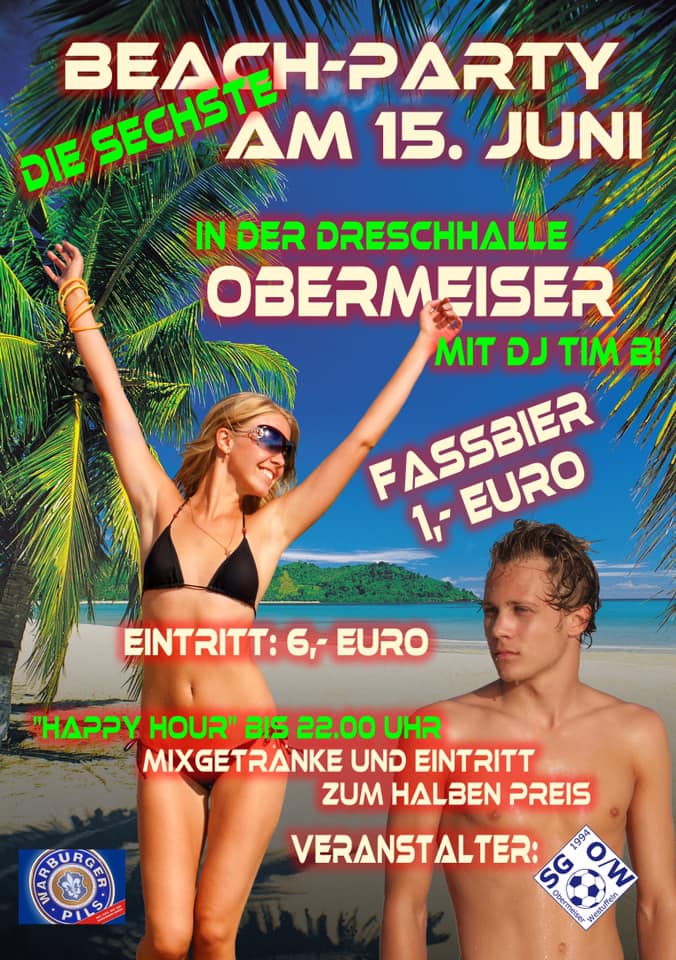 Am Samstag, den 15.06., veranstaltet der Förderverein der SG Obermeiser/Westuffeln wieder seine Beachparty in der Dreschhalle Obermeiser!